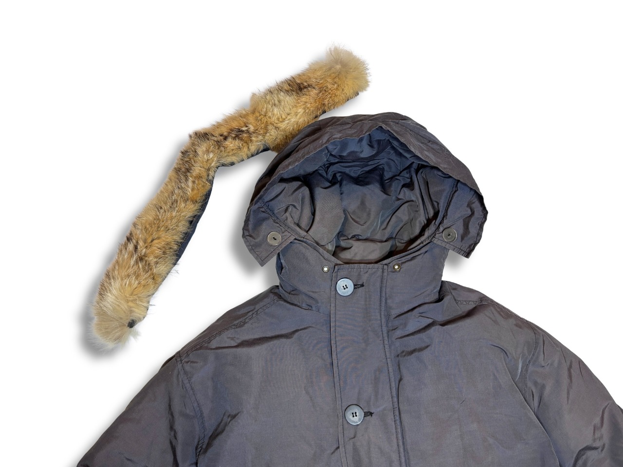 フードに取り付けられた、コヨーテファーはボタンで取り外し可能です。