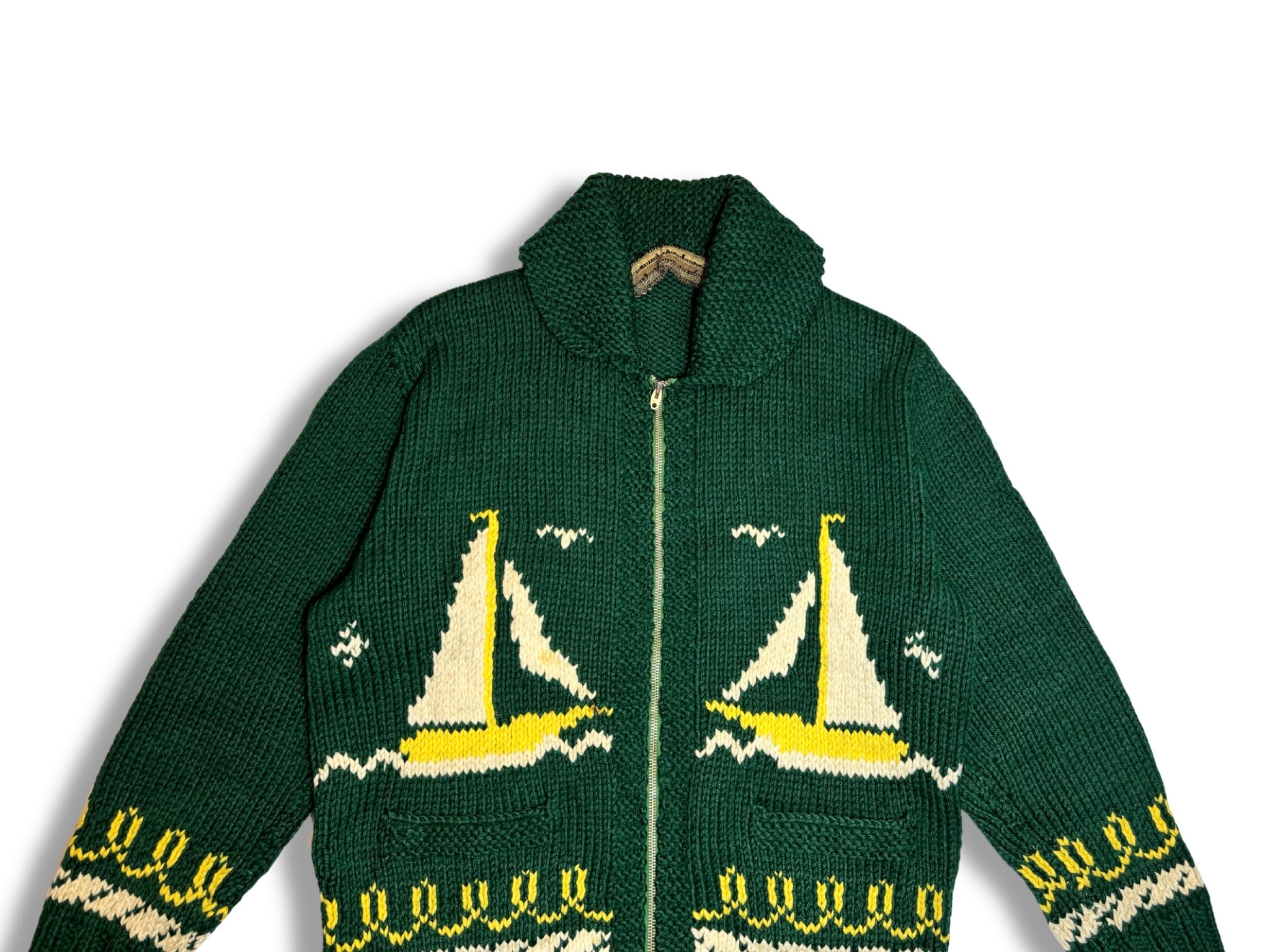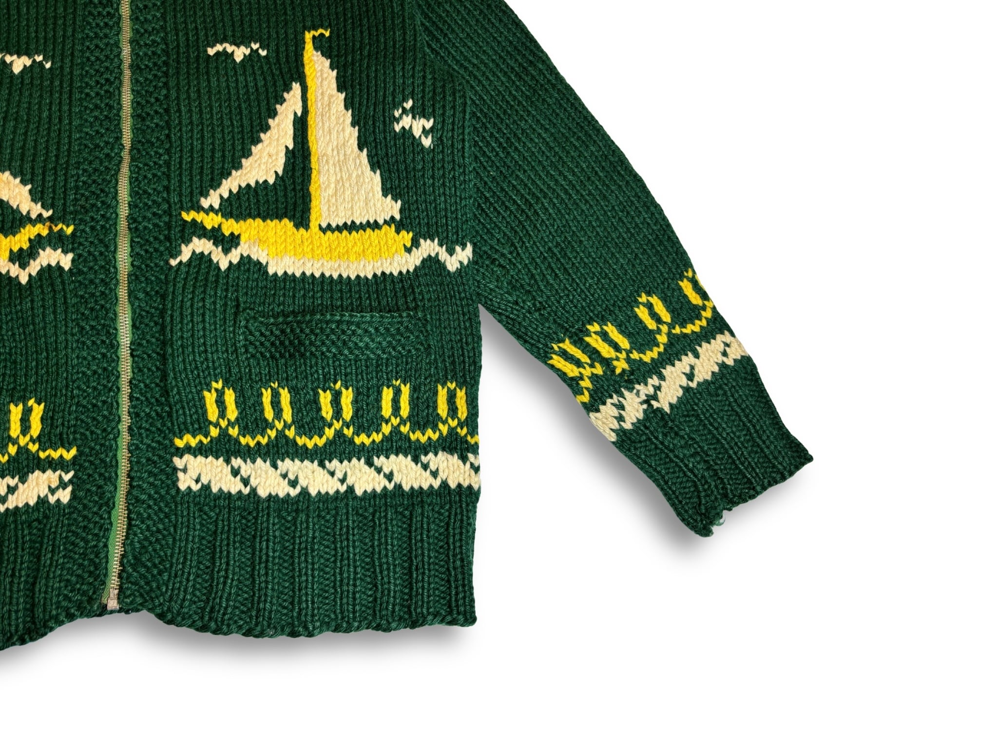 様々な柄があるカウチンですが、こちらはヨット柄がデザインされた非常にユニークな一着。