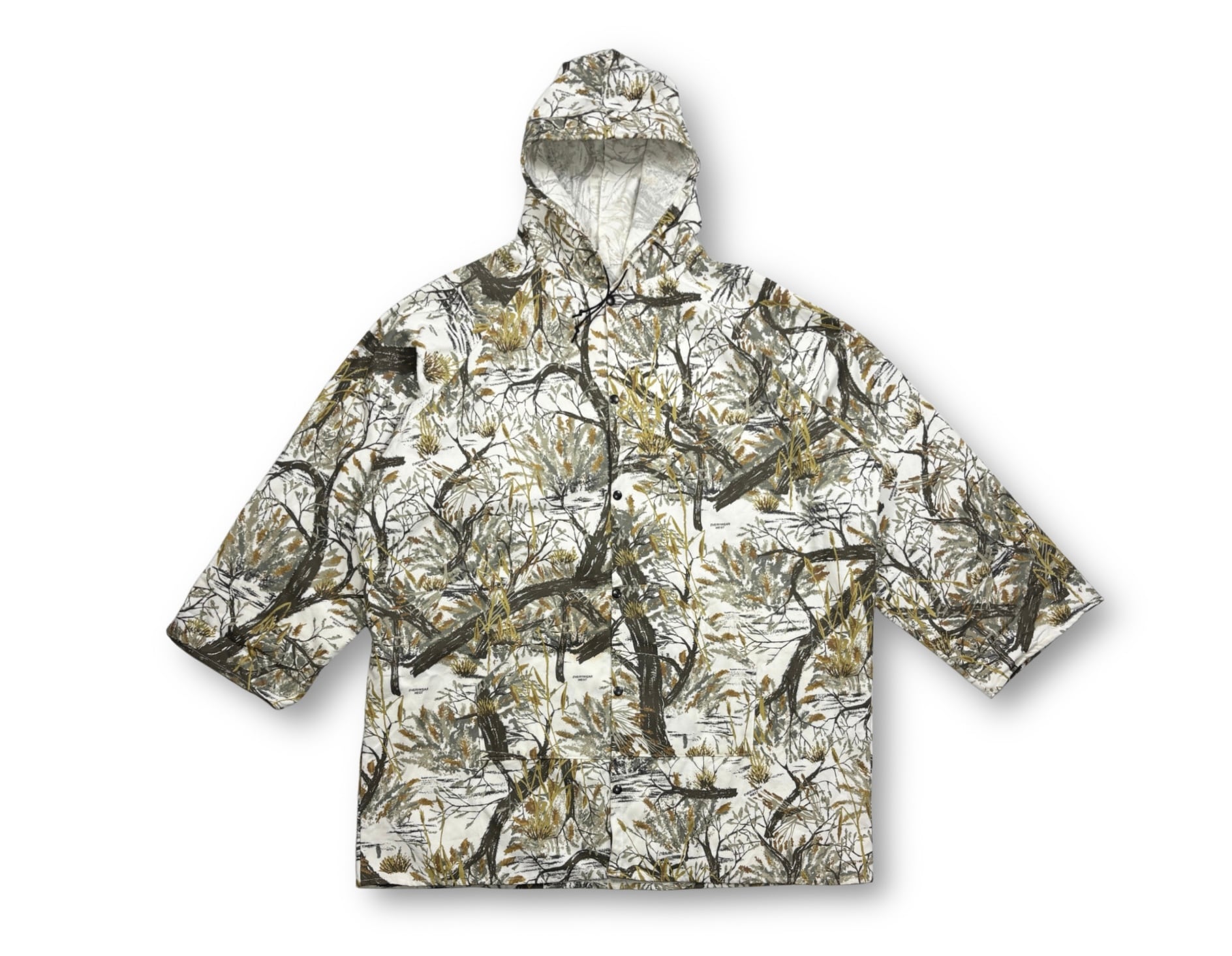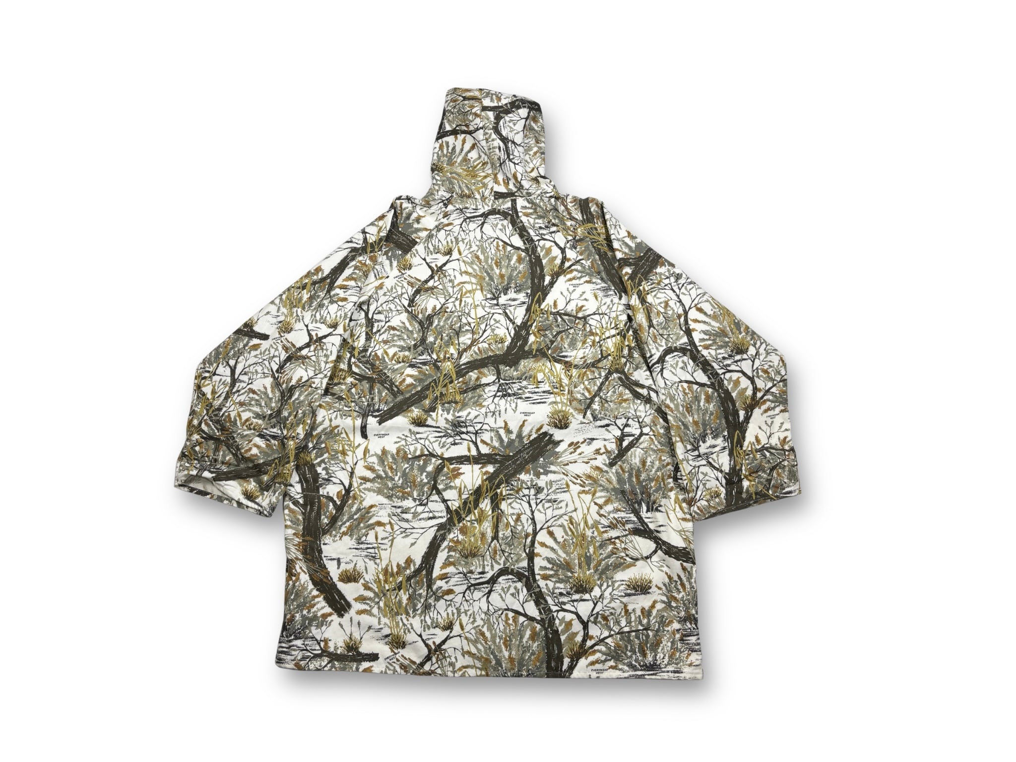 EVERYWEAR WESTのカモ柄アイテムは、特に「リアルツリーカモ」と呼ばれる、木や葉っぱが写実的に描かれた迷彩パターンを特徴としています。