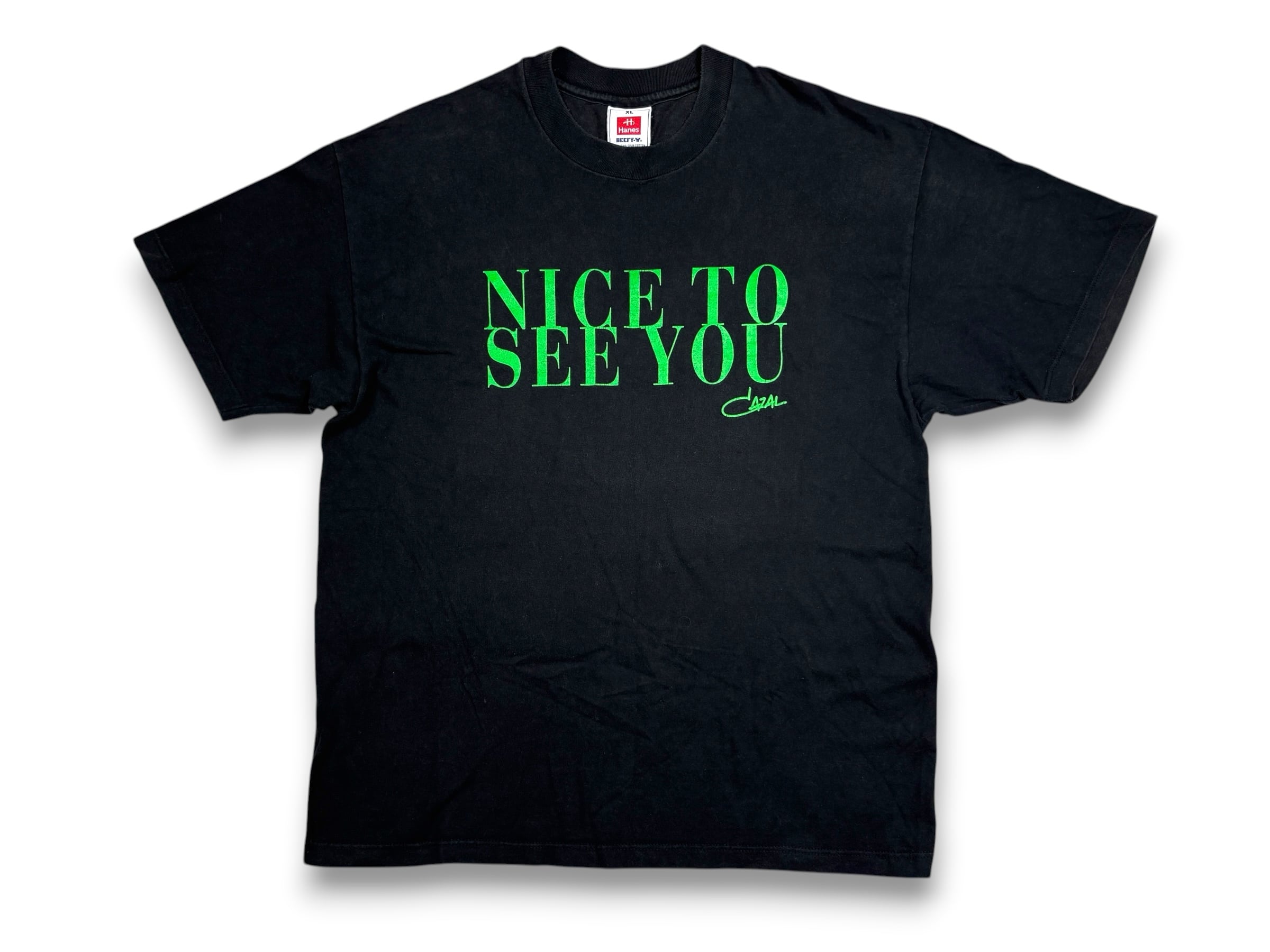 フロントの「NICE TO SEE YOU」とブランドロゴは、CAZALのフレームでも人気の高い「グリーングロウ」を彷彿とさせる鮮やかなネオングリーンでプリントされており、黒ボディに非常に映える配色です。