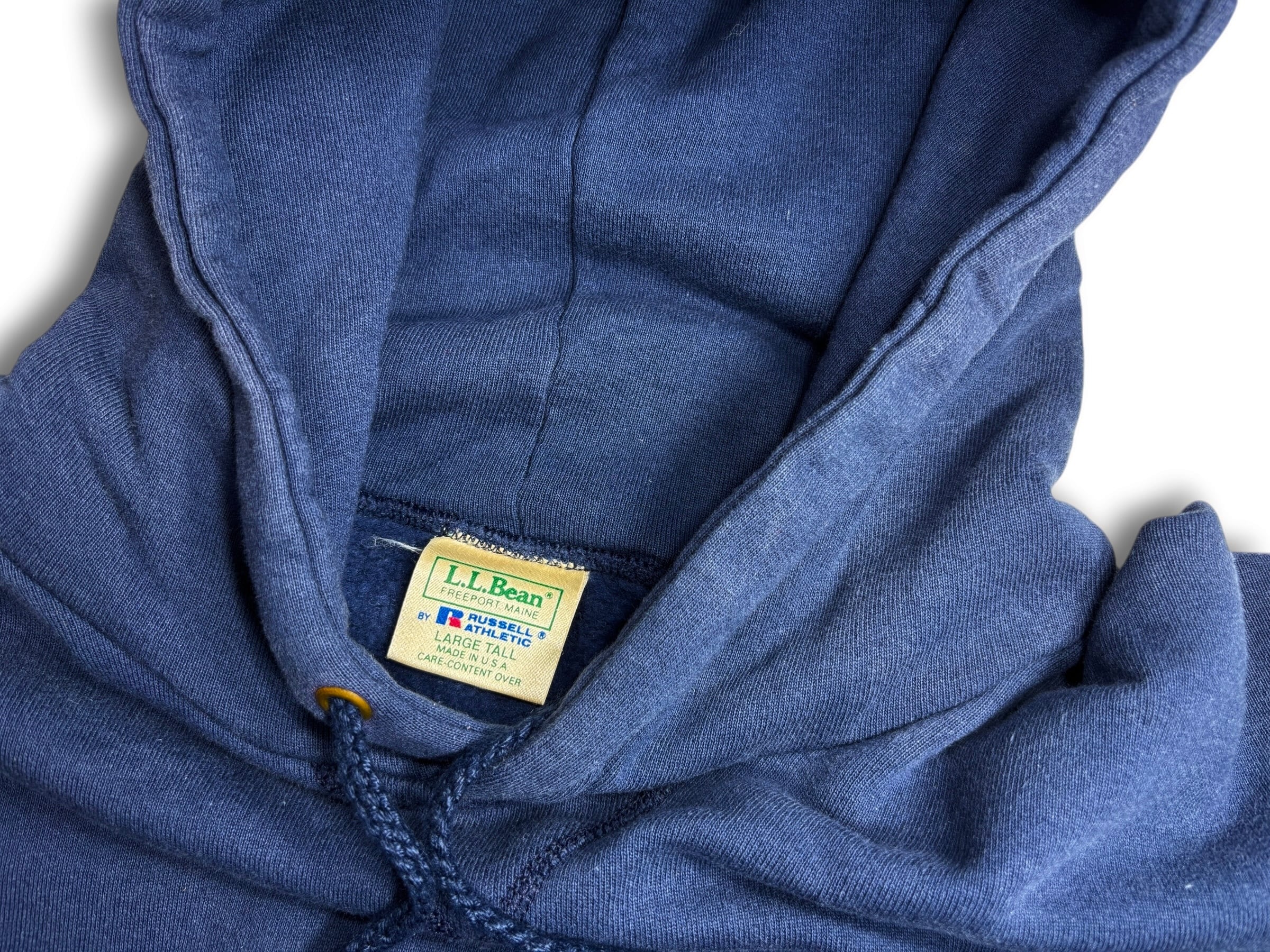 上部に緑色の文字で「L.L.Bean FREEPORT, MAINE」、下部にRussell Athleticの「R」ロゴと社名が入った、この時期特有のダブルネームタグです。