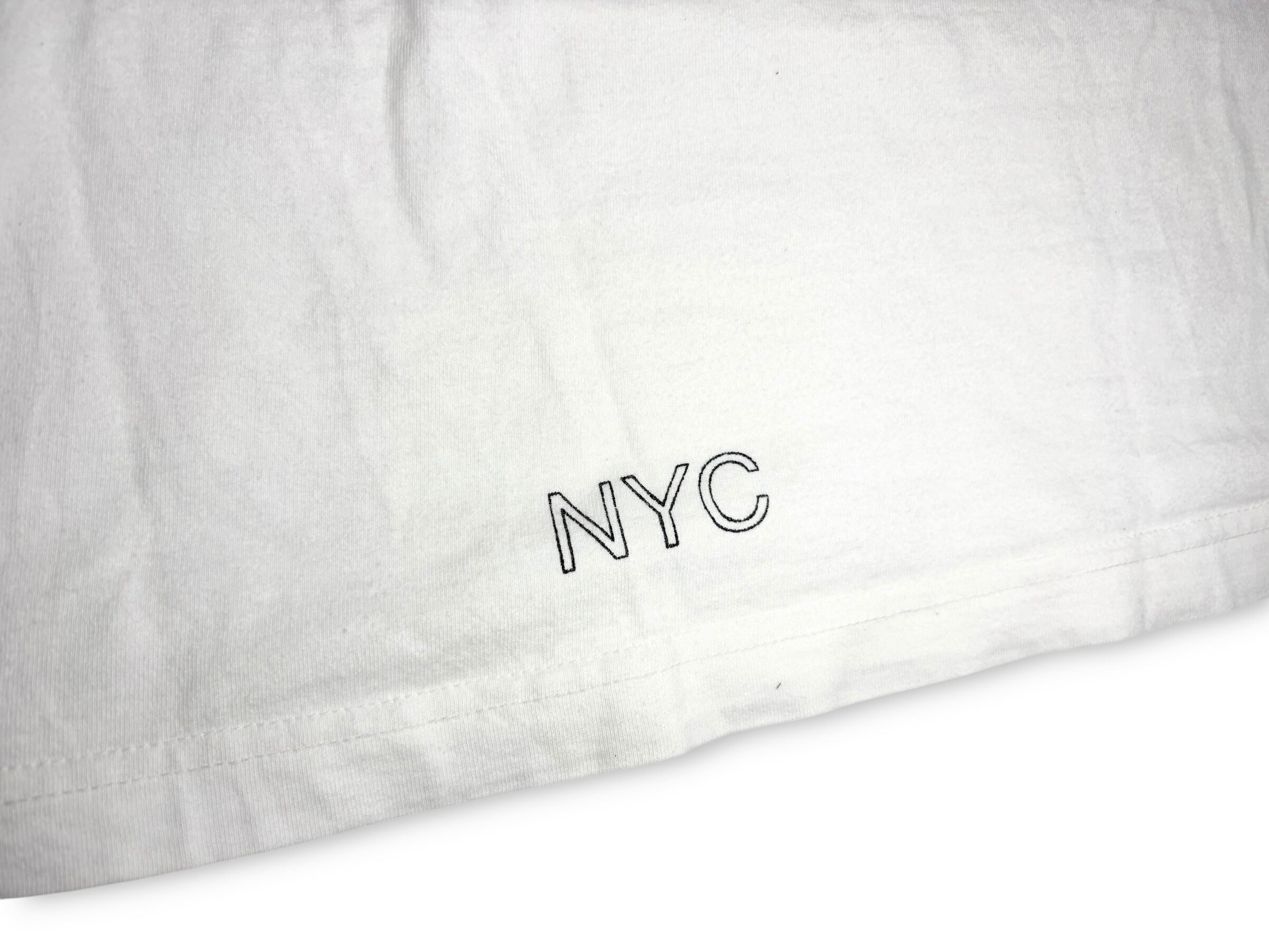 バックにはブルーのグラフィティロゴを背景にしたアイコニックなフォトプリント、裾付近には「NYC」の文字が配されています。
