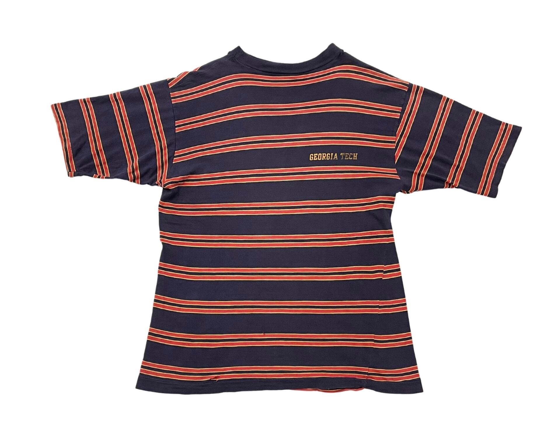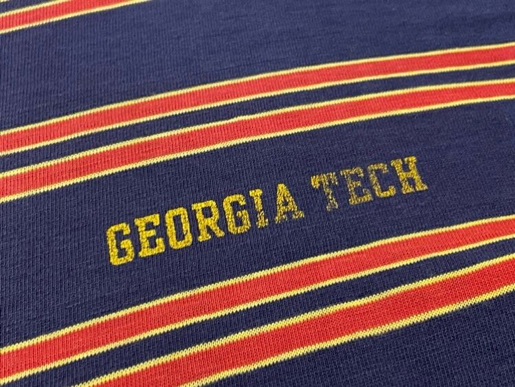 70s VELVA SHEENのボーダーTシャツの胸に、GEORGIA TECHの文字がプリントされた、ジョージア工科大学のカレッジTシャツ。