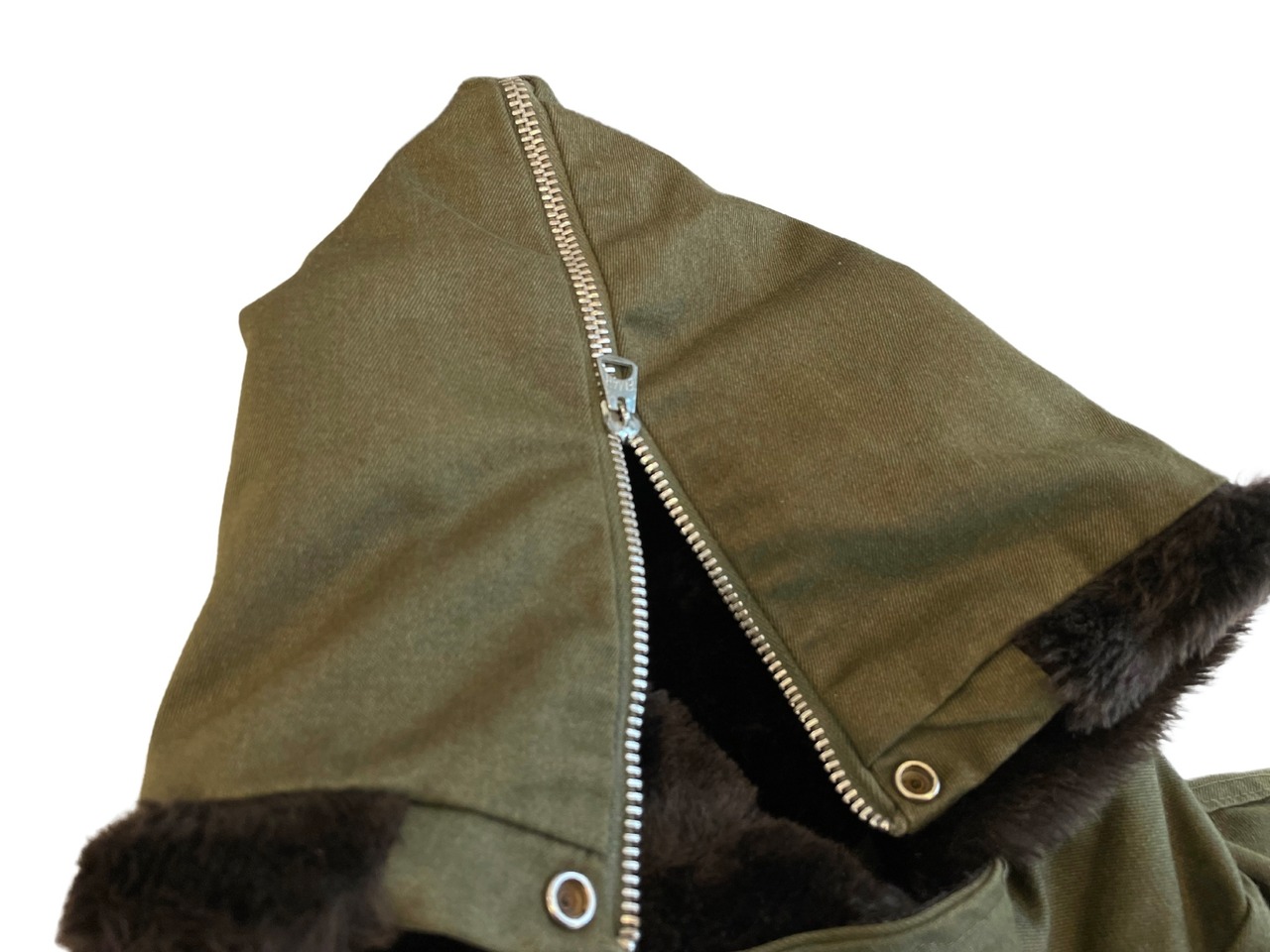 EMARアルミジップ、チンストラップ付き、キルティングライナー、袖内にニットリブ、フードに紐&ボアあり、ウエストバックにゴム入り、フードはEMARアルミジップでセーラーカラーになります。